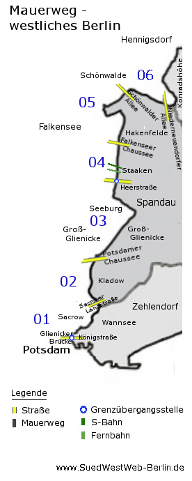 Der Mauerweg im Westen von Berlin berührt die Bezirke Zehlendorf (Bezirksteile Wannsee) und Spandau (Bezirksteile Kladow, Groß-Glienicke, Staaken und Hakenfelde).