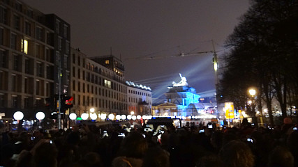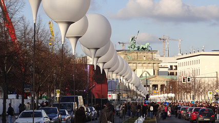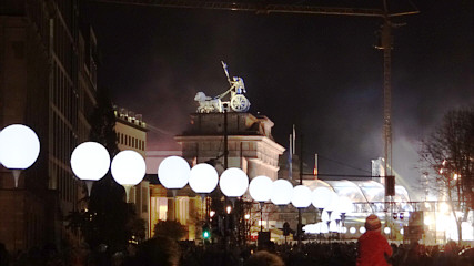 25 Jahre Mauerfall - Lichtgrenze - 9. November 2014In Berlin fand am Abend des 9. November 2014 die zentrale Gedenkfeier zum 25. Jahrestags des Mauerfalls vom 9. November 1989 statt. Aus Anlaß dieses Jahrestags wurde bereits Tage vorher die sogenannte Lichtgrenze aus zirka 8.000 weiß leuchtenden Ballonen installiert. Diese Lichtgrenze oder auch Lichtmauer markierte im Zentrum auf 15 Kilometer einen Teil des ehemaligen Verlaufs der Berliner Mauer als leuchtende Mauer von der Bornholmer Brücke, über den Mauerpark, der Bernauer Straße, dem Reichstag, dem Brandenburger Tor, dem Checkpoint Charlie, der Eastside Gallery bis zur Oberbaumbrücke. Um 19:00 Uhr begann der Aufstieg der Ballone in den Berliner Nachthimmel als Symbol für die Maueröffnung vor 25 Jahren. Begleitet wurde die Lichtinstallation von zahlreichen Informations-, Show- und Unterhaltungsprogrammen. Programmhöhepunkte waren sicherlich die Auftritte von Udo Lindenberg und der Staatskapelle Berlin.